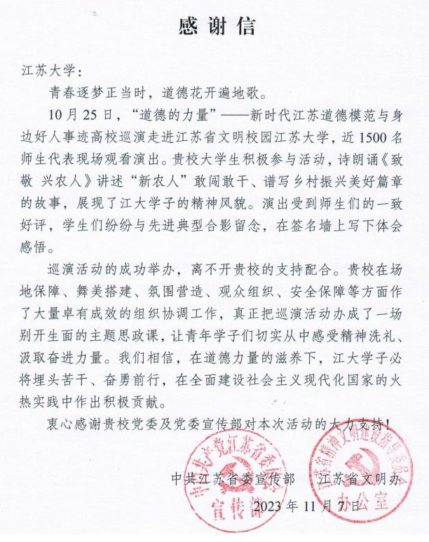 近日,江苏省委宣传部、省文明办向我校发来感谢信,对我校在“道德的力量”——新时代江苏道德模范与身边好人事迹巡演走进新利体育(中国)官方网站中所做工作提出高度赞扬,对我校为全省精神文明建设作出的重要贡献表示衷心感谢。