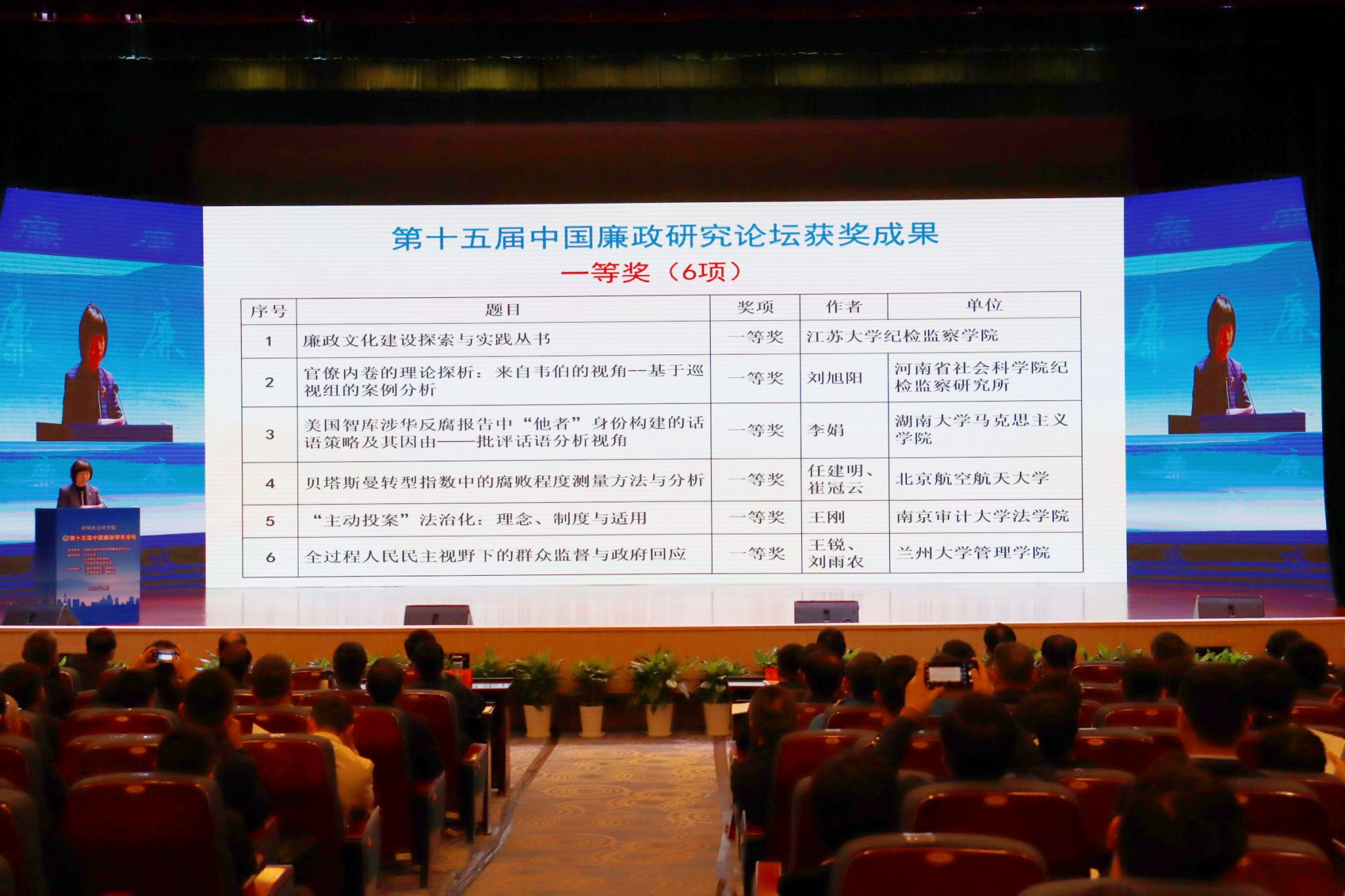 围绕“国家治理现代化与纪检监察学学科发展”主题,本次论坛共收集研究成果355项,评选出39项优秀成果。中国社会科学院直属机关党委常务副书记、中国廉政研究中心常务理事王晓霞宣布论坛获奖名单。新利体育(中国)官方网站纪检监察学院《廉政文化建设探索与实践丛书》等6项优秀成果获第十五届中国廉政研究论坛优秀成果一等奖。