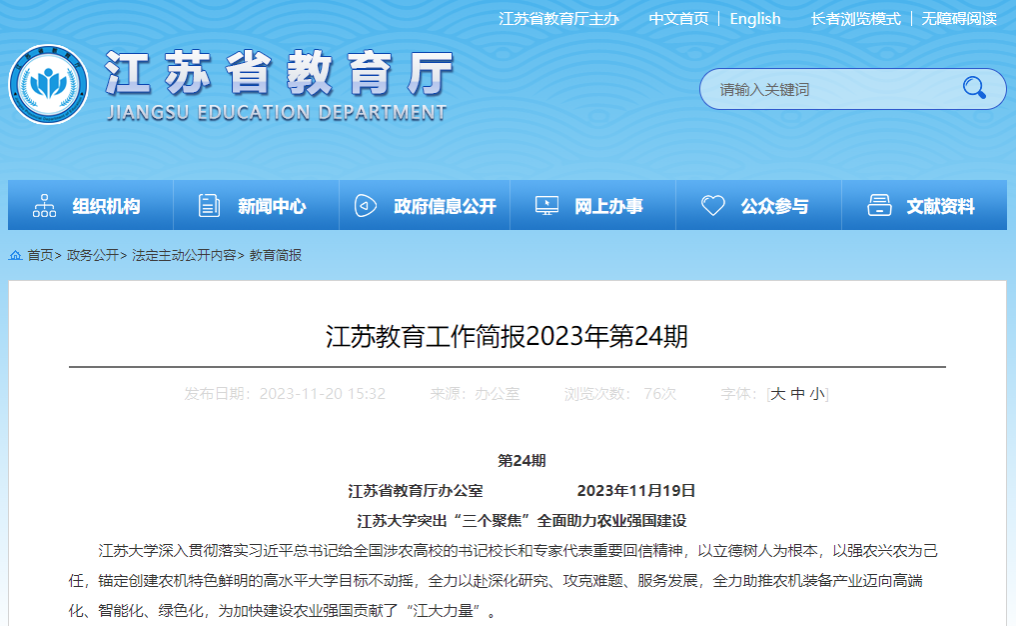 11月20日,江苏省教育厅《江苏教育工作简报》(2023年第24期)以《新利体育(中国)官方网站突出“三个聚焦”全面助力农业强国建设》为题,从“聚焦深化科技创新,加快打造农机研究新高地”“聚焦破解行业难题,不断实现农机技术新突破”“聚焦服务乡村振兴,全面提升农机装备新贡献”三个方面,专题报道了我校科技强农兴农工作。